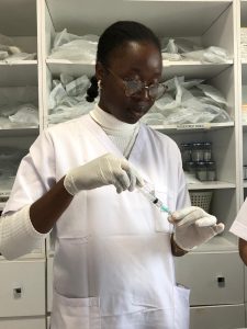 Ana, an intern, is preparing the equipment to administer IV infusions.